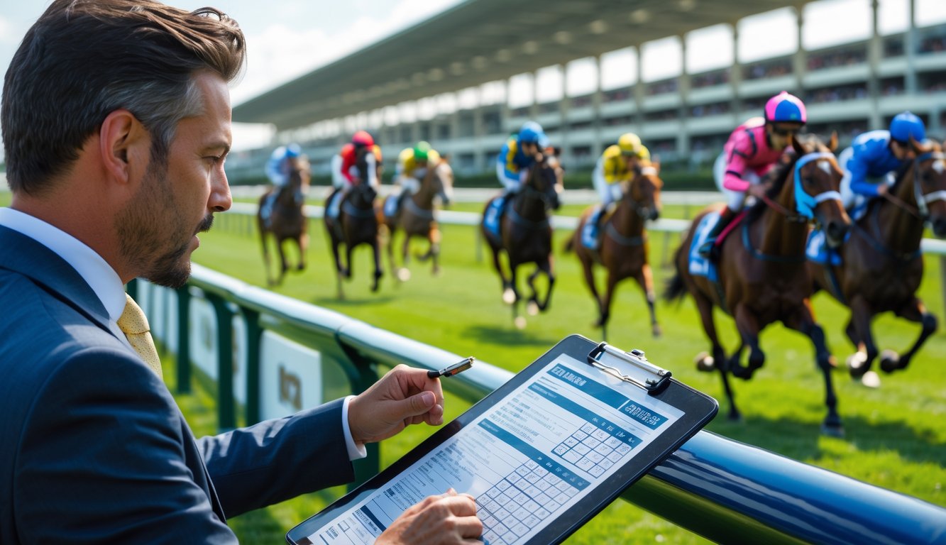 Seorang pria berpakaian rapi sedang mempelajari data balap kuda di dekat trek balap dengan beberapa kuda dan joki yang sedang berlomba di latar belakang.