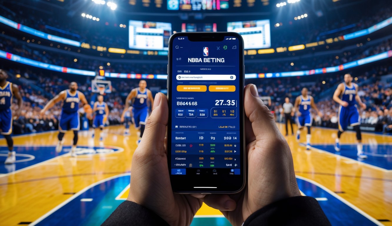 Seorang pria memegang ponsel dengan aplikasi taruhan NBA saat pertandingan bola basket berlangsung di arena penuh penonton.